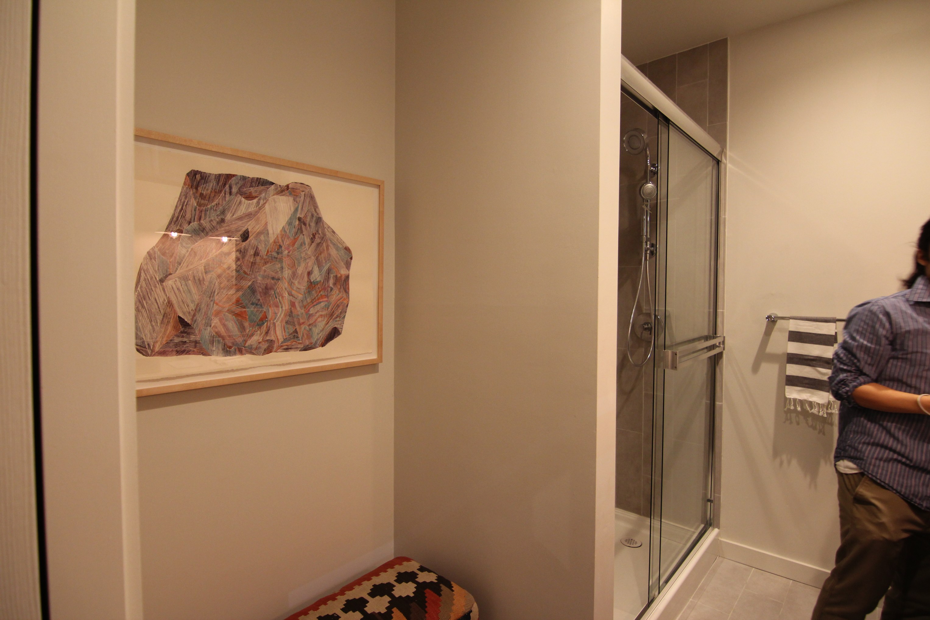 . . . and two pieces by Simone Shubuck stacked on the opposite wall next to a built in, two-door closet (Dotty on the top and Steath Grandma Speak on the bottom).